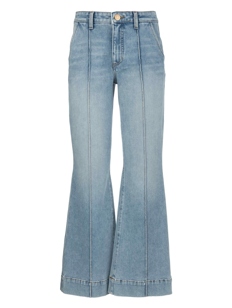 Elevate your denim game with these high-rise flare jeans, designed with Fab Ab front pockets for a smooth, flattering fit. Crafted in a super stretchy, medium wash denim, they feature a front pin tuck detail that elongates the legs and adds a touch of polish. Perfect for day-to-night style with built-in comfort and shape-enhancing design.
