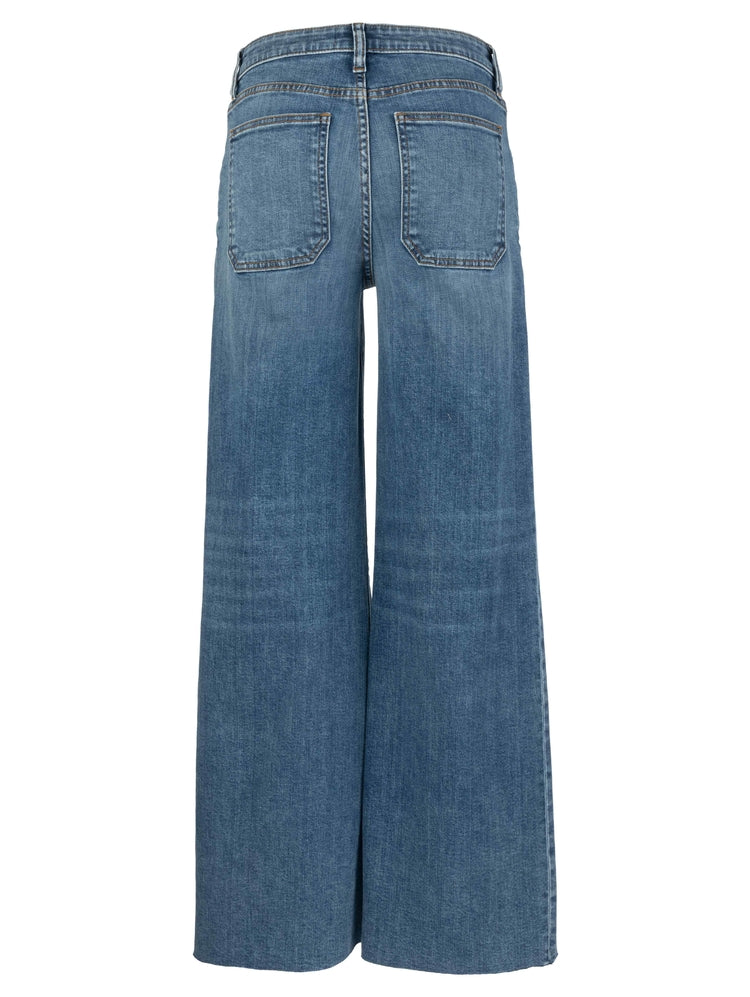 Maya will be your new favorite. High-rise jeans in a versatile medium wash, designed with a flattering wide-leg silhouette. Crafted from very stretchy material for all-day comfort and ease of movement, they feature distinctive porkchop pockets with reverse inset detailing that adds a modern, standout touch. Finished with a raw hem, these jeans offer a trendy, effortlessly edgy look.