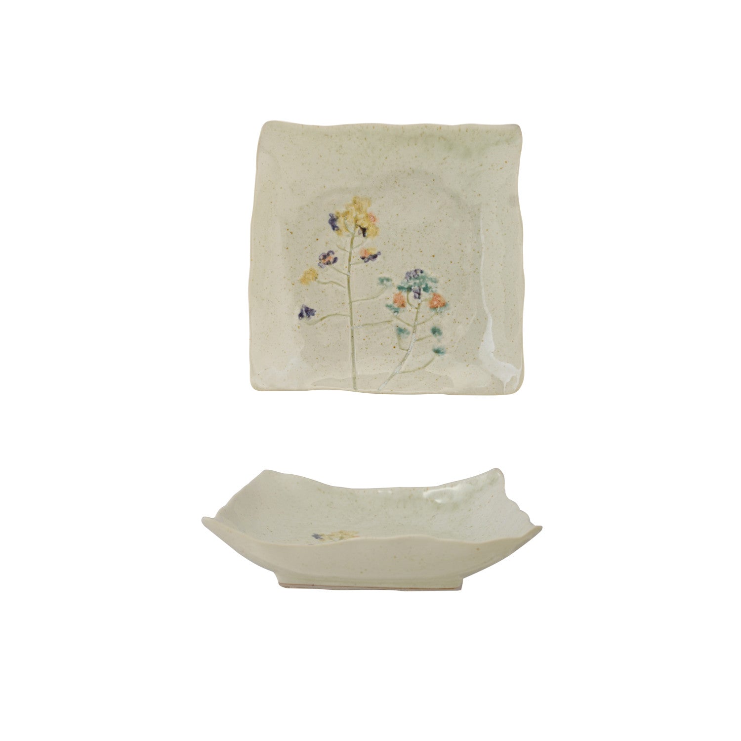 This charming hand-painted stoneware dish brings artisanal character to any space. Each piece is uniquely crafted with delicate floral designs, making it a one-of-a-kind addition to your home. The organic 7" square shape and natural stoneware construction offer both visual appeal and practical functionality—perfect for displaying jewelry, holding small trinkets, or serving as a decorative accent on shelves and nightstands. The handmade quality ensures no two dishes are exactly alike, celebrating the beauty of artisanal craftsmanship.