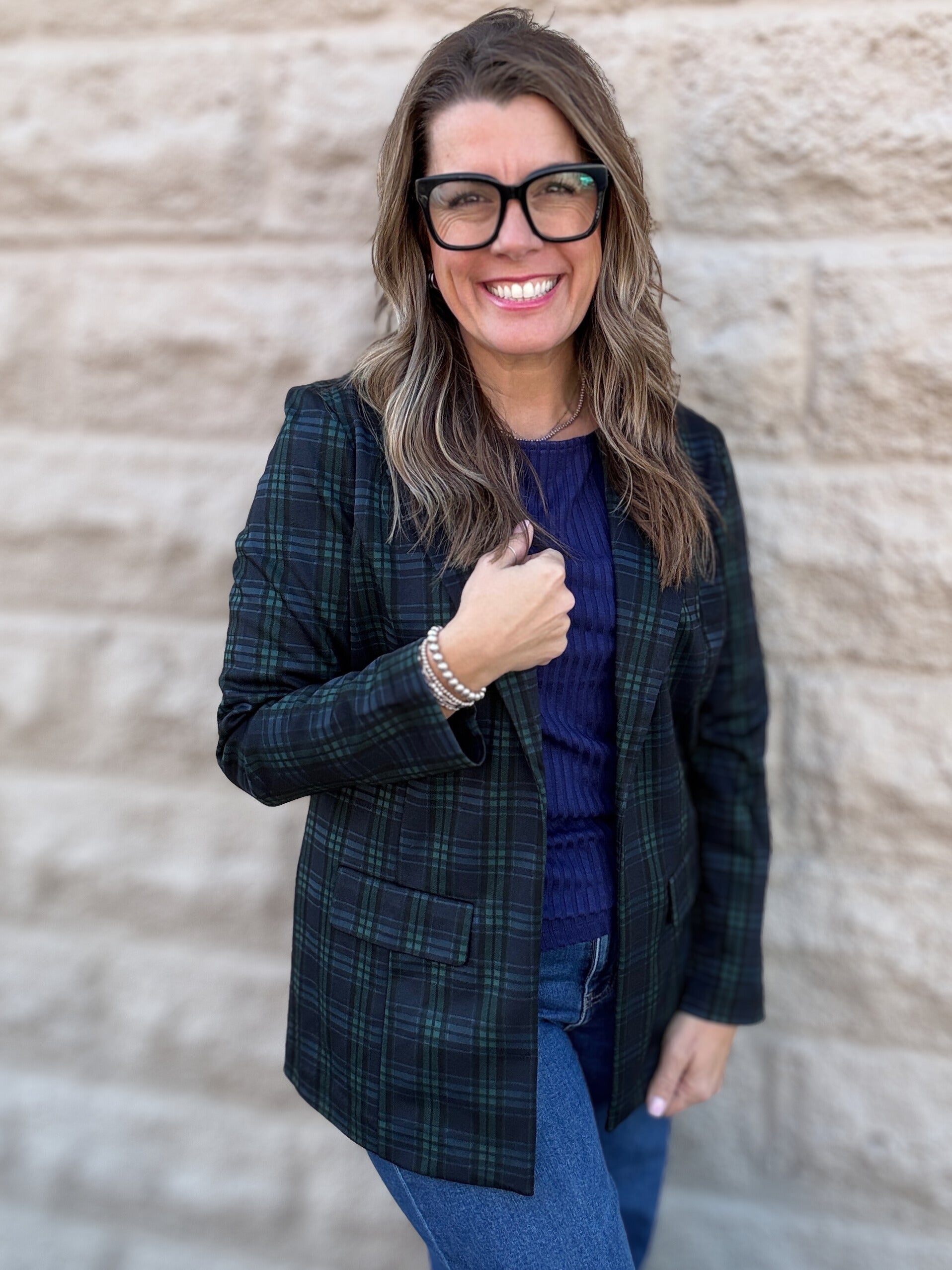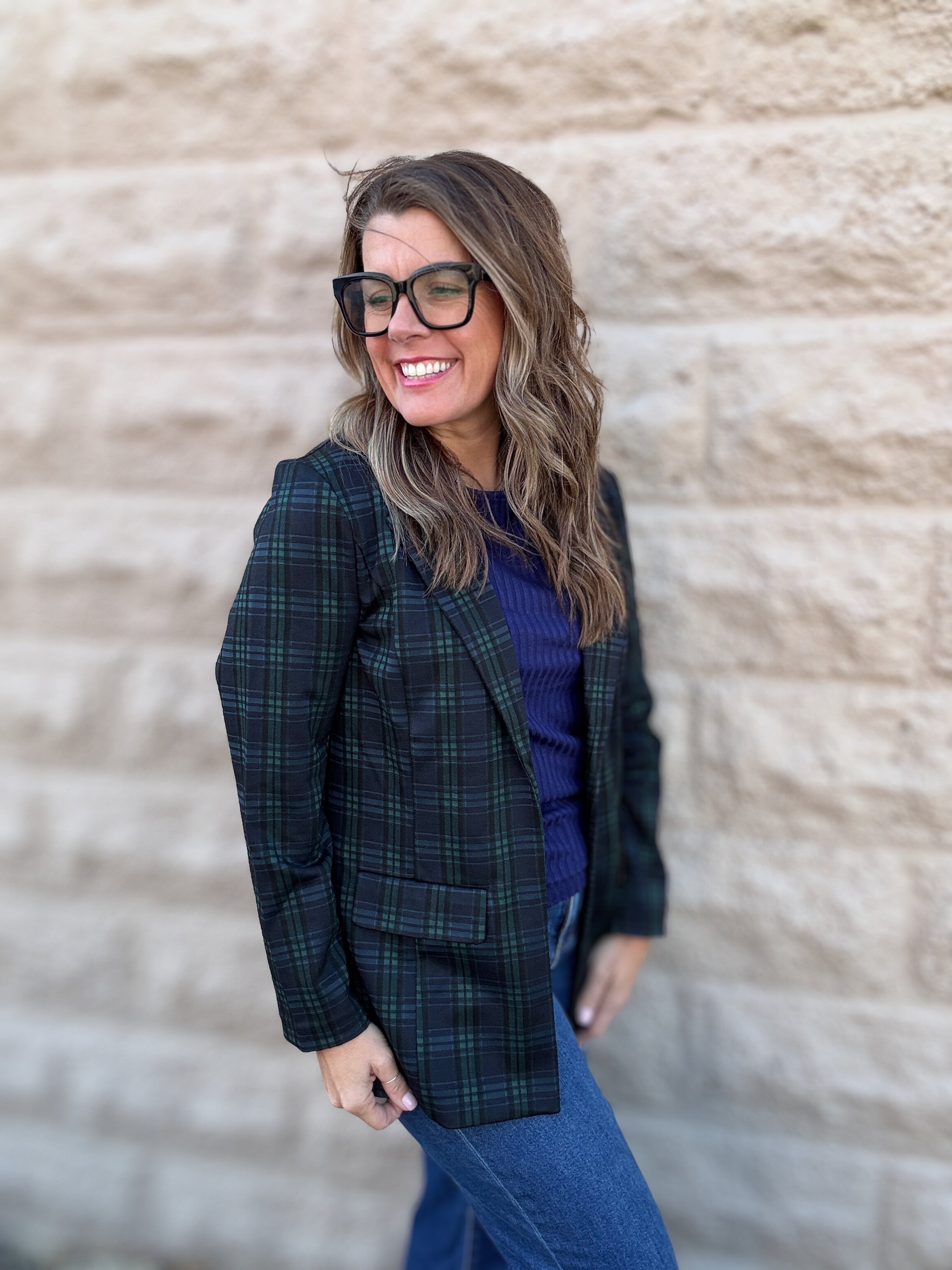 The must-have blazer of the season is here. This boyfriend blazer in Black Watch Plaid combines tailored sophistication with a relaxed fit for effortless versatility. The rich plaid brings a heritage feel that pairs seamlessly with denim or trousers.