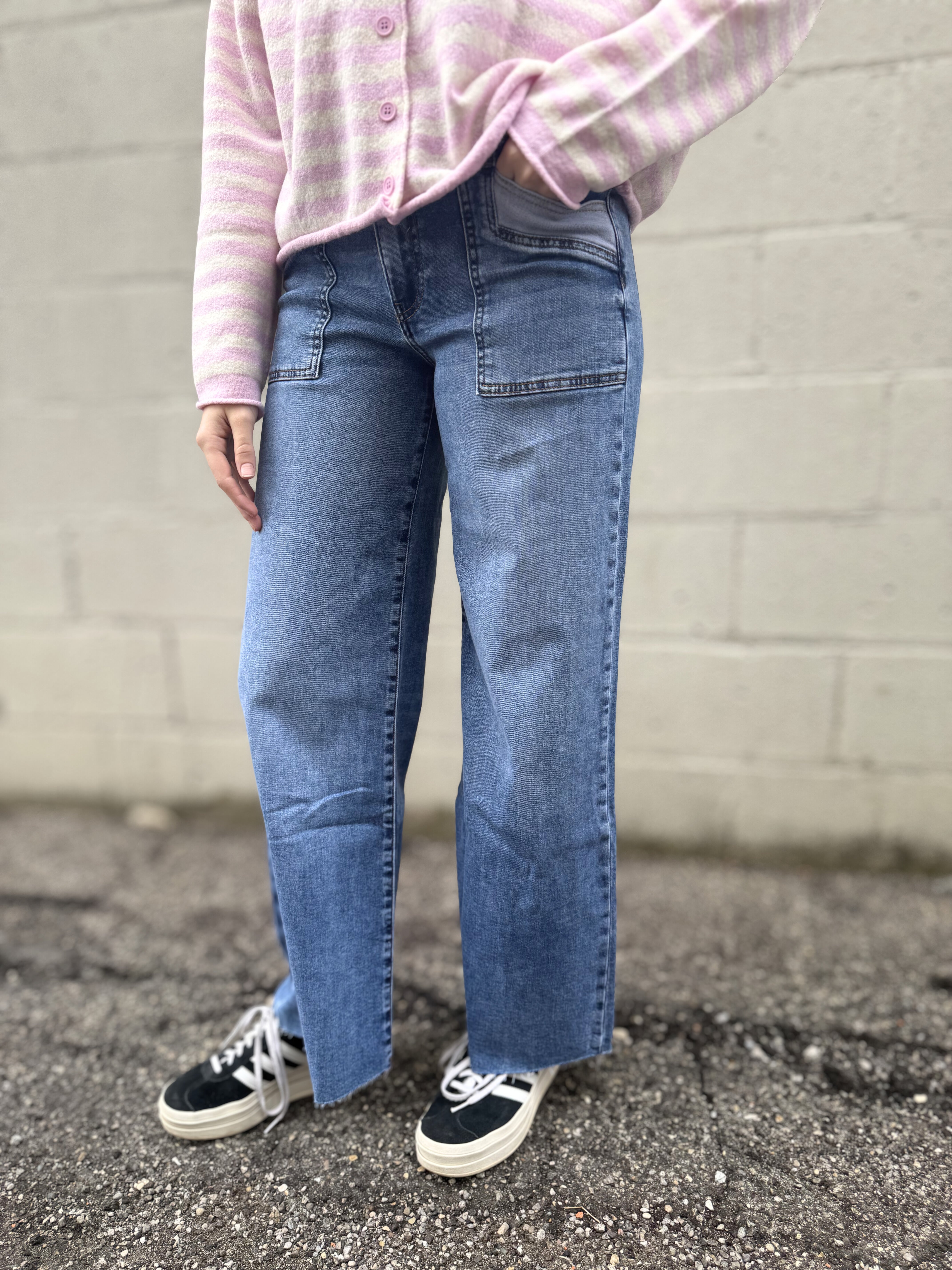 Maya will be your new favorite. High-rise jeans in a versatile medium wash, designed with a flattering wide-leg silhouette. Crafted from very stretchy material for all-day comfort and ease of movement, they feature distinctive porkchop pockets with reverse inset detailing that adds a modern, standout touch. Finished with a raw hem, these jeans offer a trendy, effortlessly edgy look.