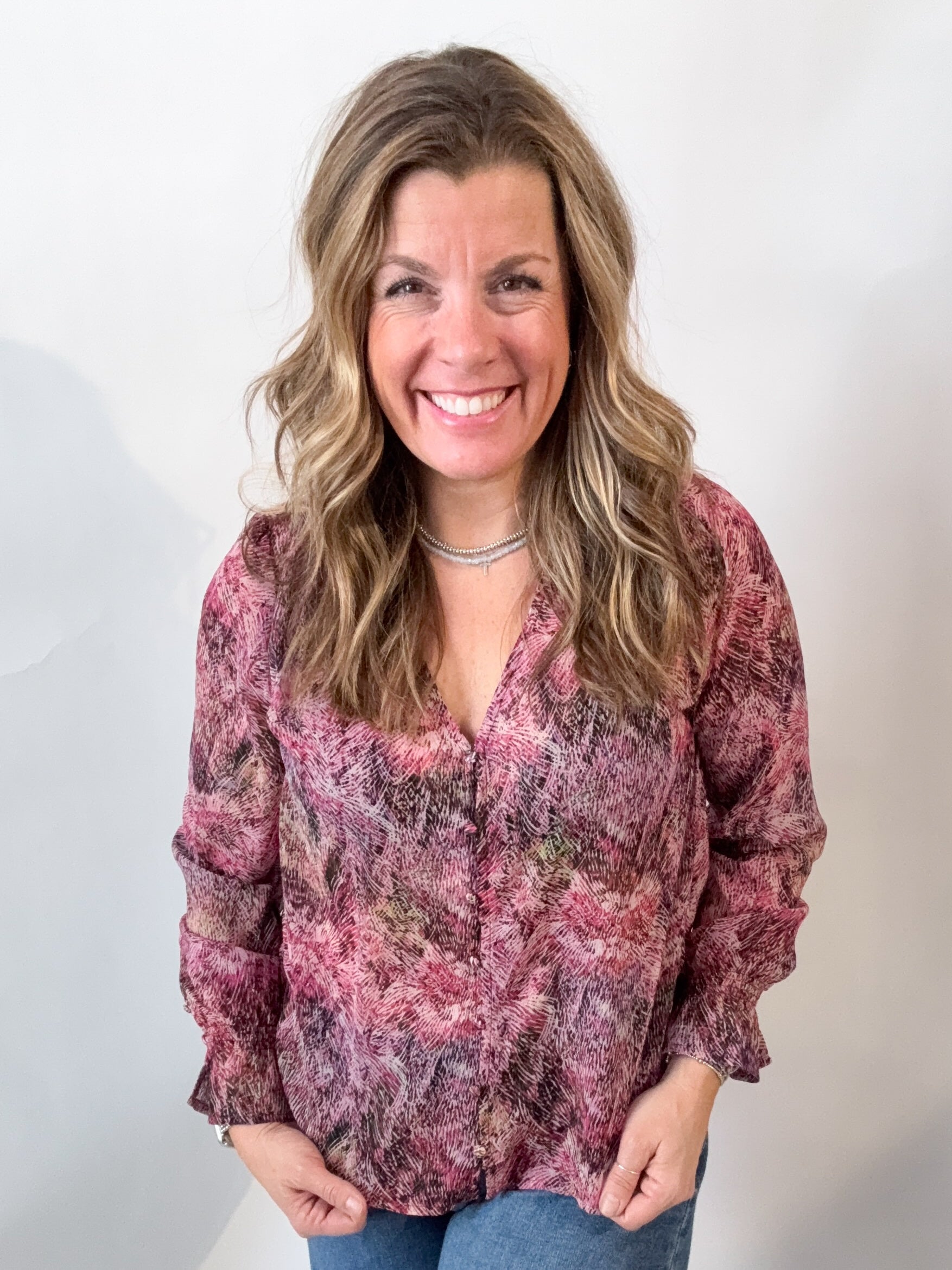An easy, feminine essential designed to elevate everyday dressing. Soft smocking at the cuffs adds subtle texture, while the relaxed silhouette and button front make it effortless to style from day to night. Polished, wearable, and endlessly versatile.