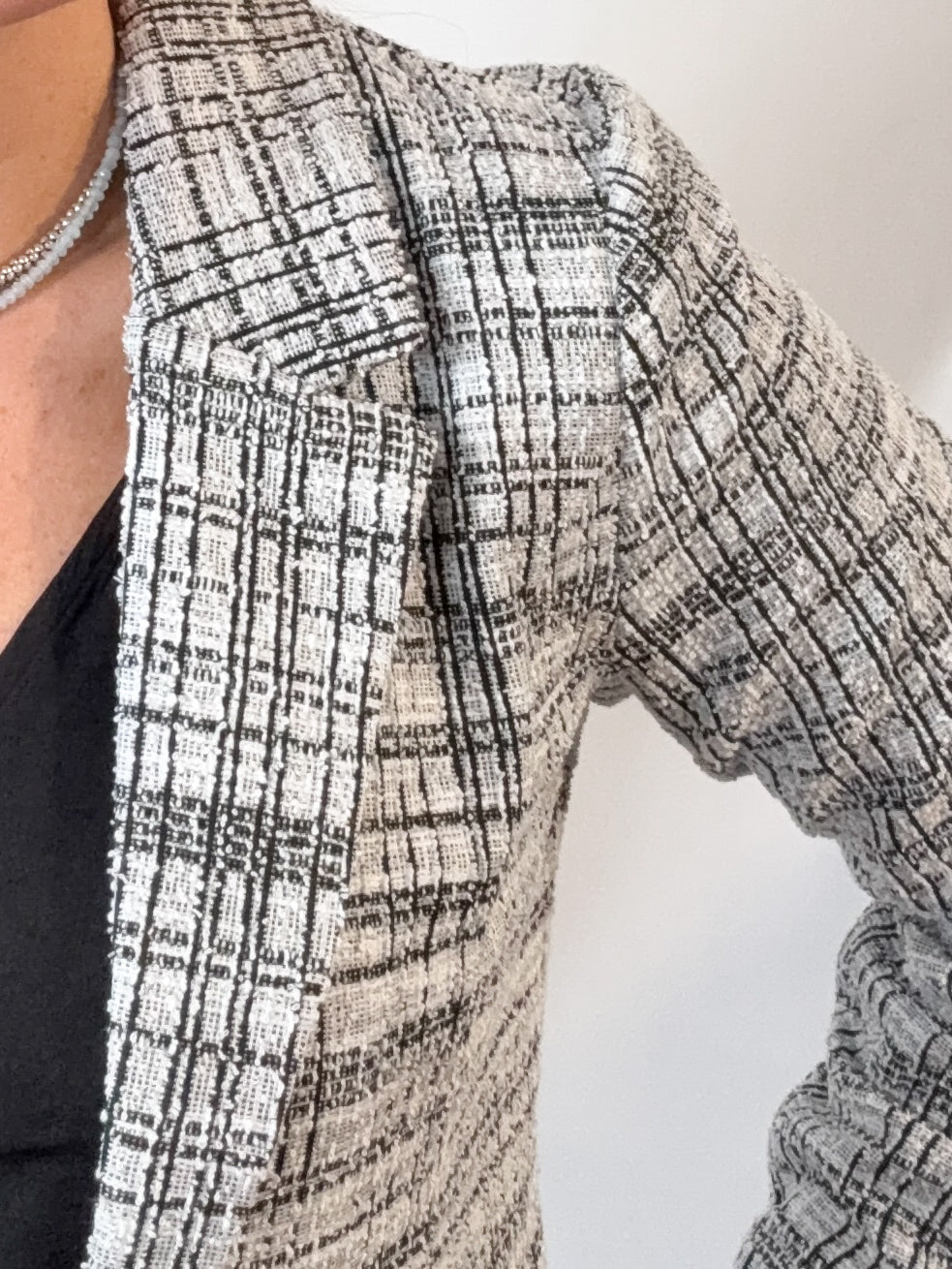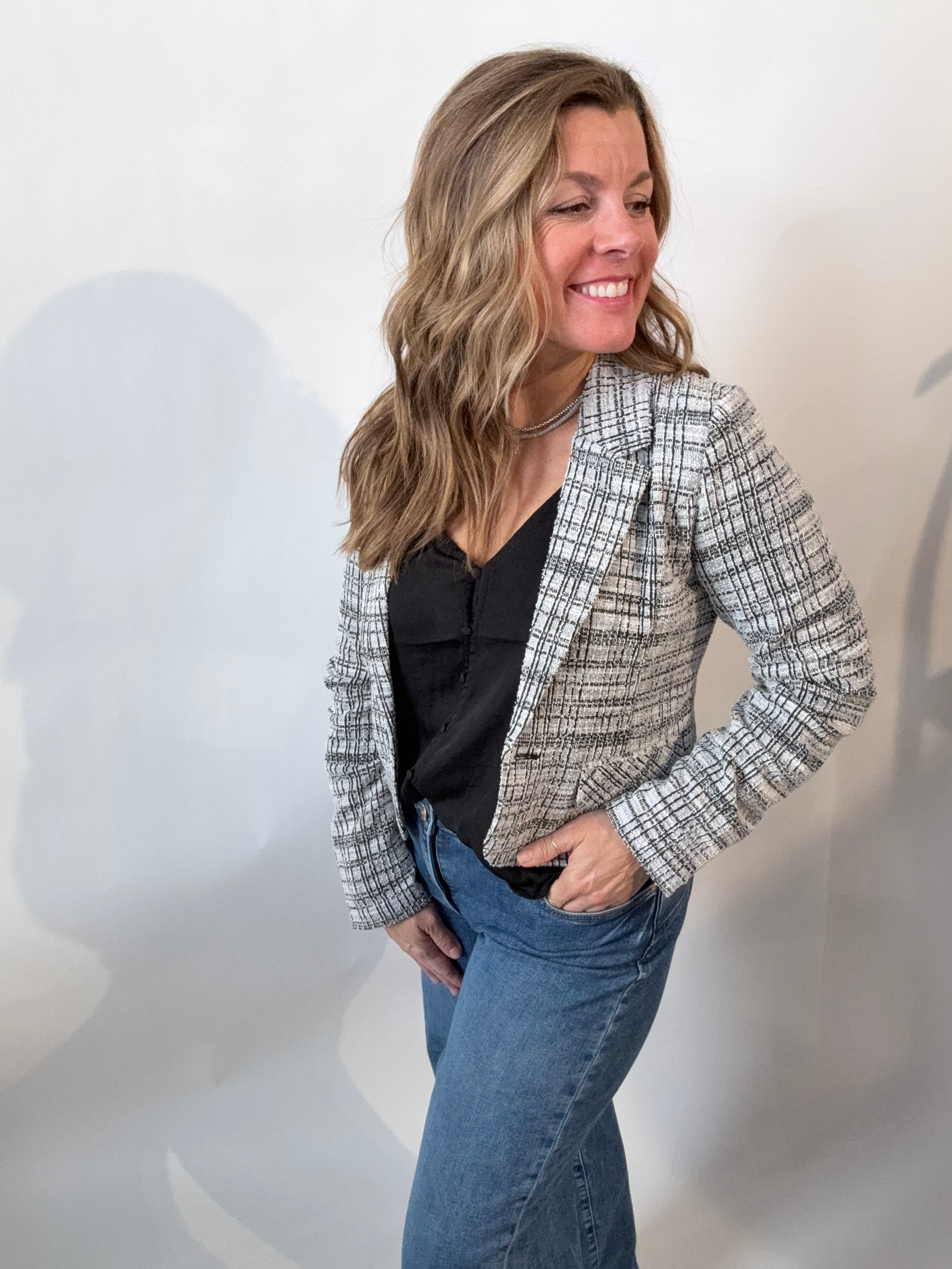A modern take on classic tailoring, this cropped blazer delivers structure with a fresh proportion. The black and white plaid adds timeless interest while the shortened length creates a confident, fashion-forward silhouette. Designed to layer effortlessly, it brings polish to denim, trousers, and matching sets alike.