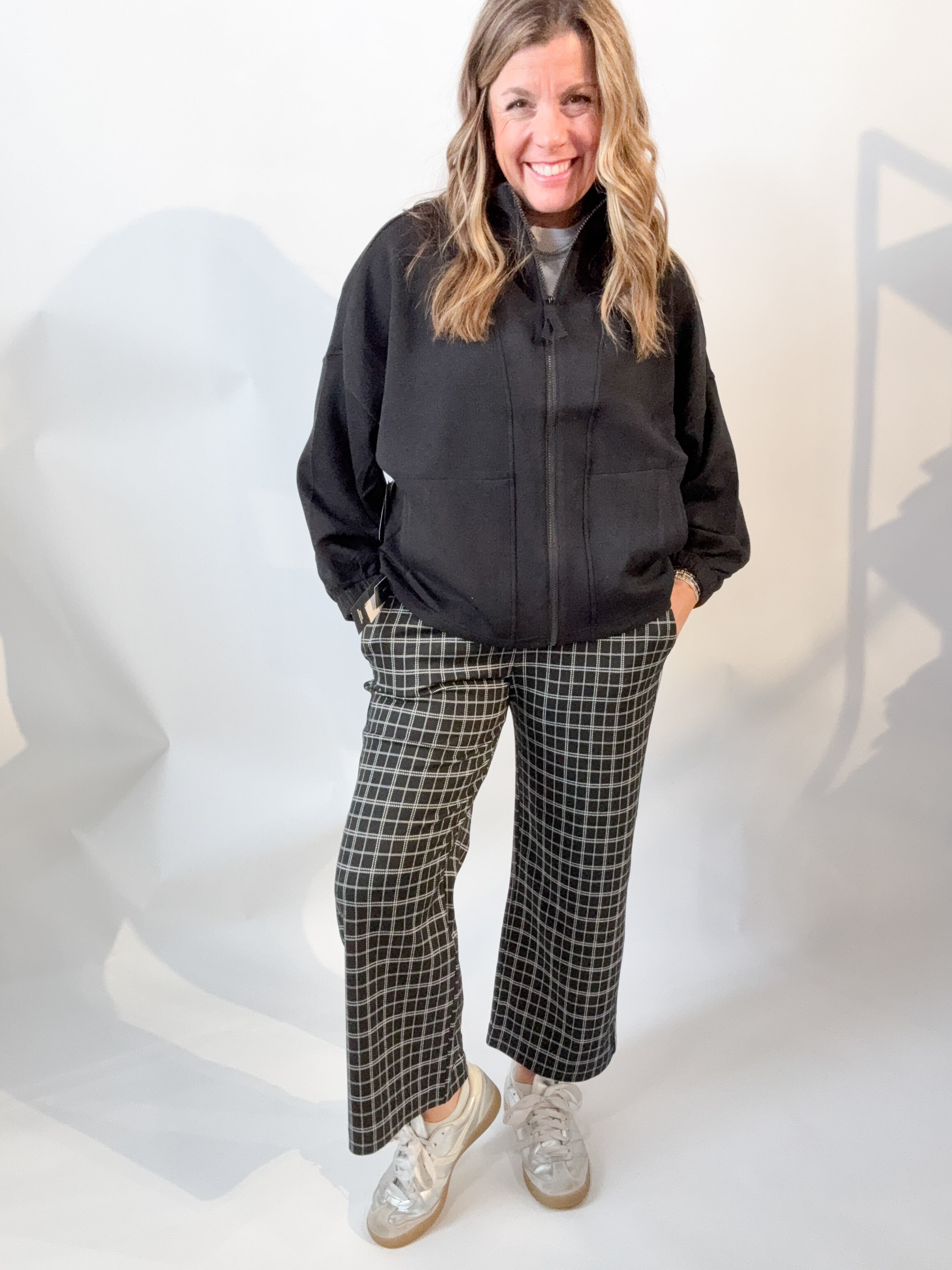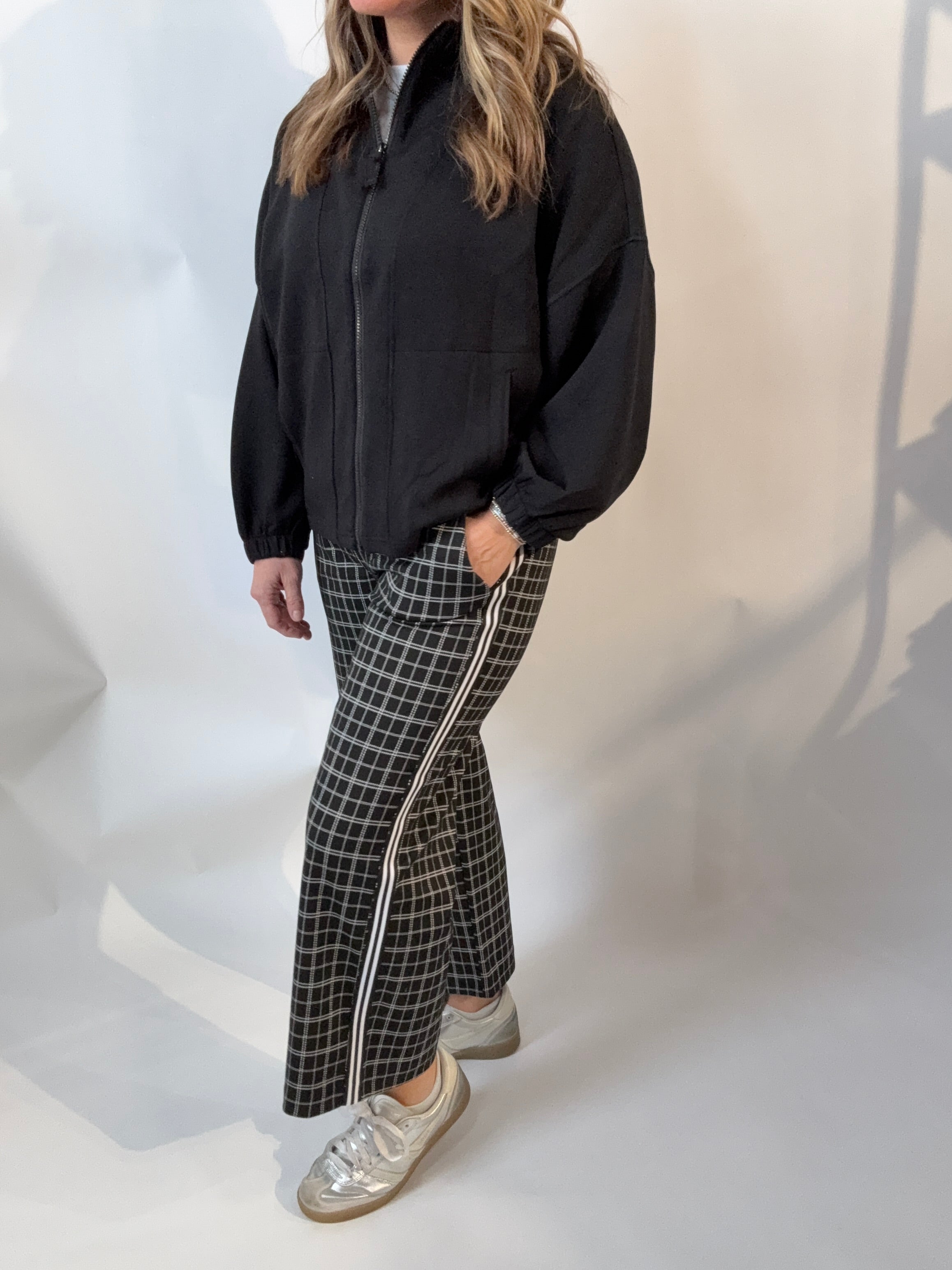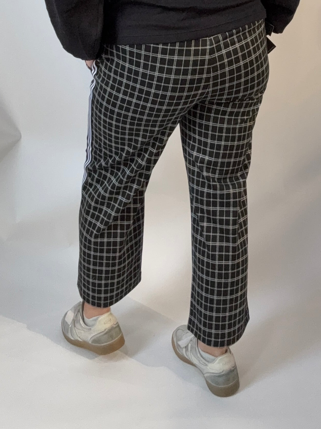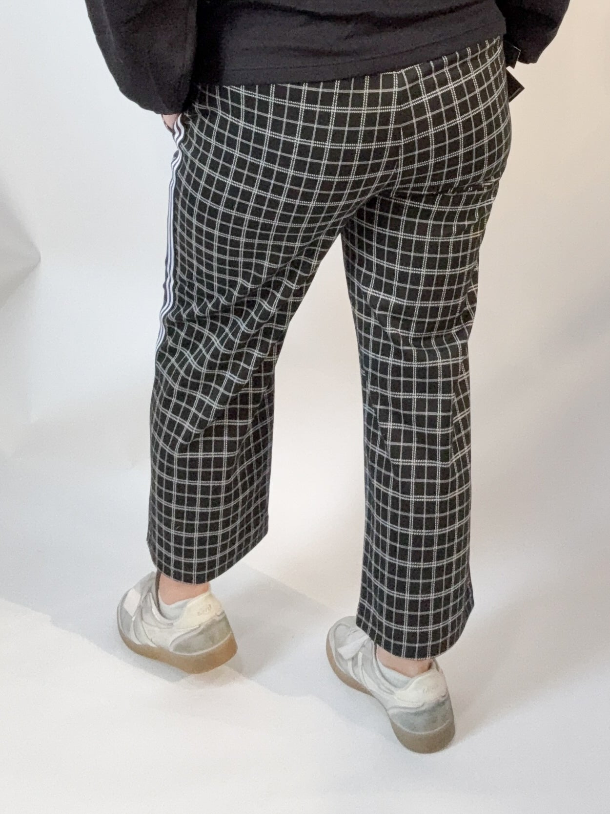 Designed with a clean pull-on waistband and a straight, wide leg shape, it feels comfortable without sacrificing style. A graphic black and white plaid is finished with a side stripe, adding contrast. Effortlessly style with a simple top or jacket, this piece makes getting dressed feel easy.