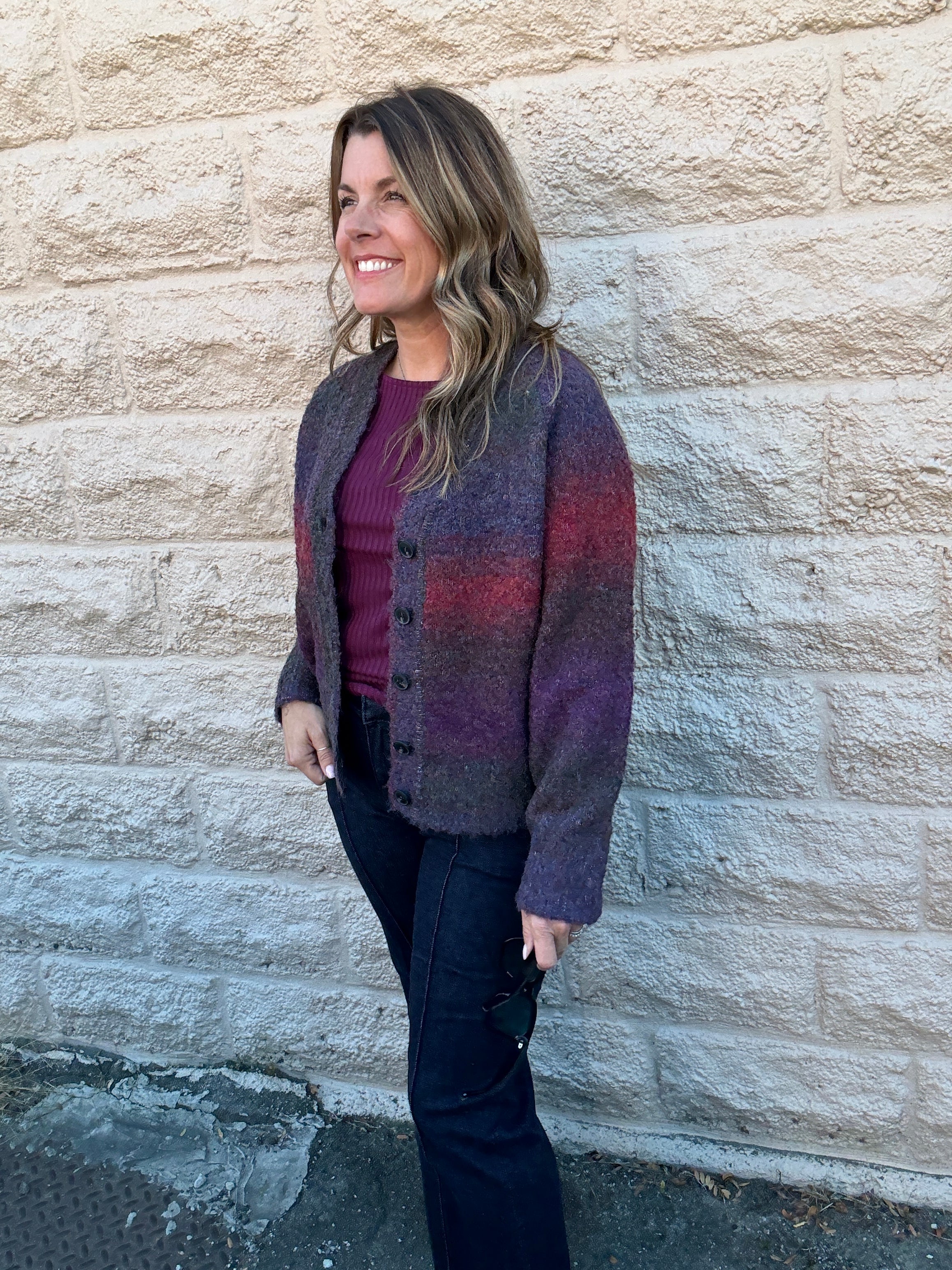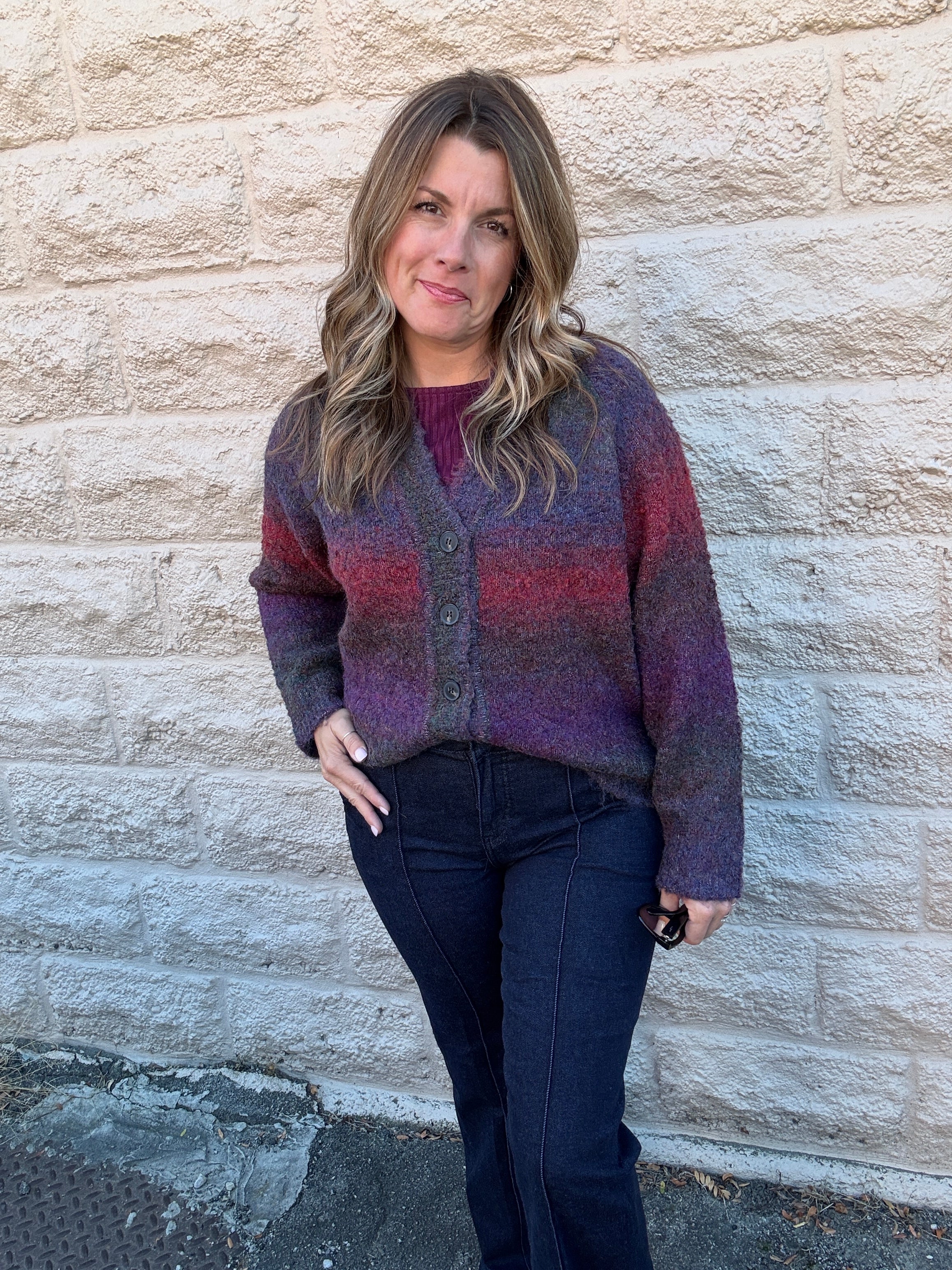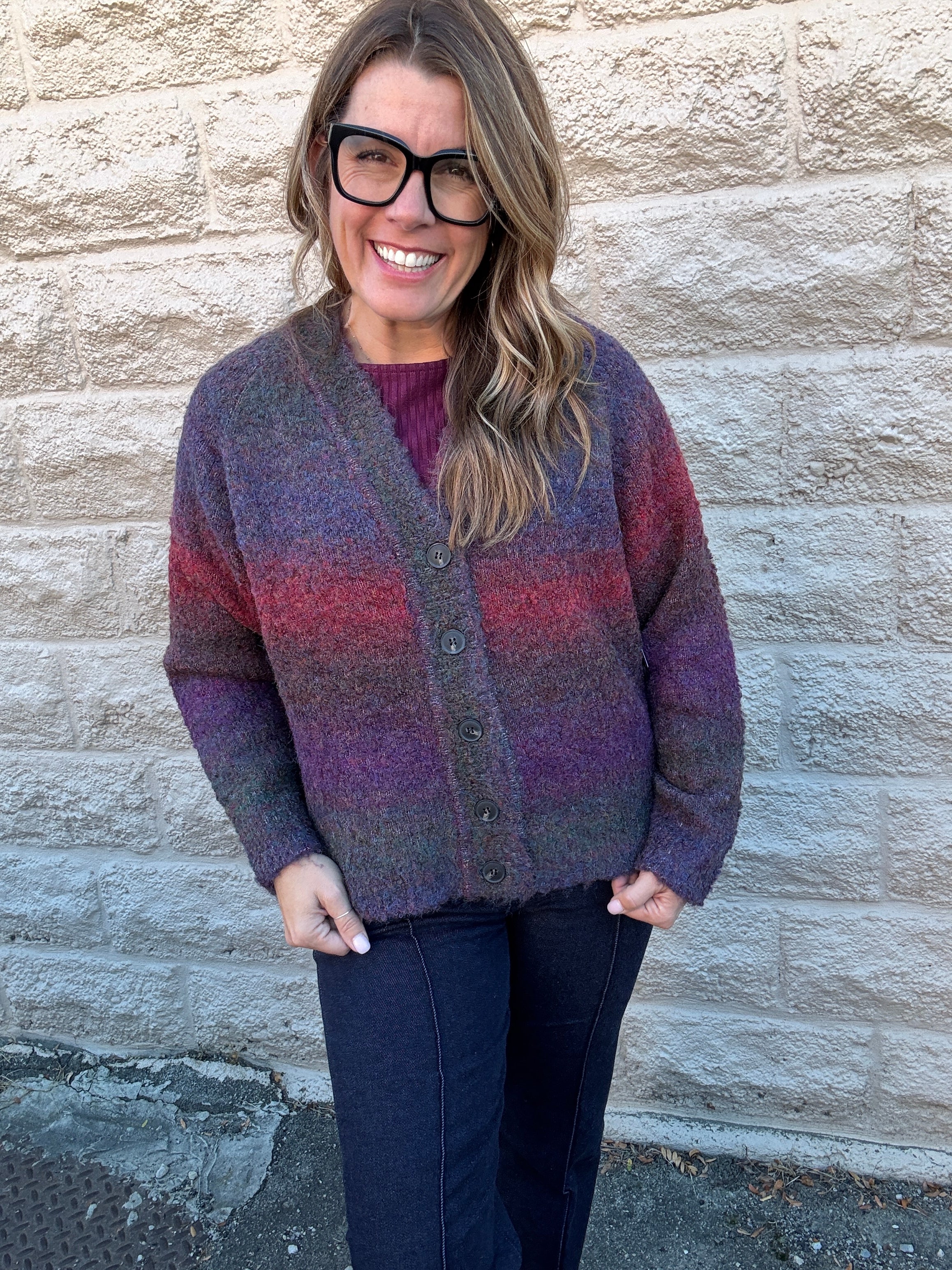 The Ombre Cardigan is a perfect cozy sweater for busy girls on the go.  Here fun colorful pattern pairs back to wine, navy, gray or black.