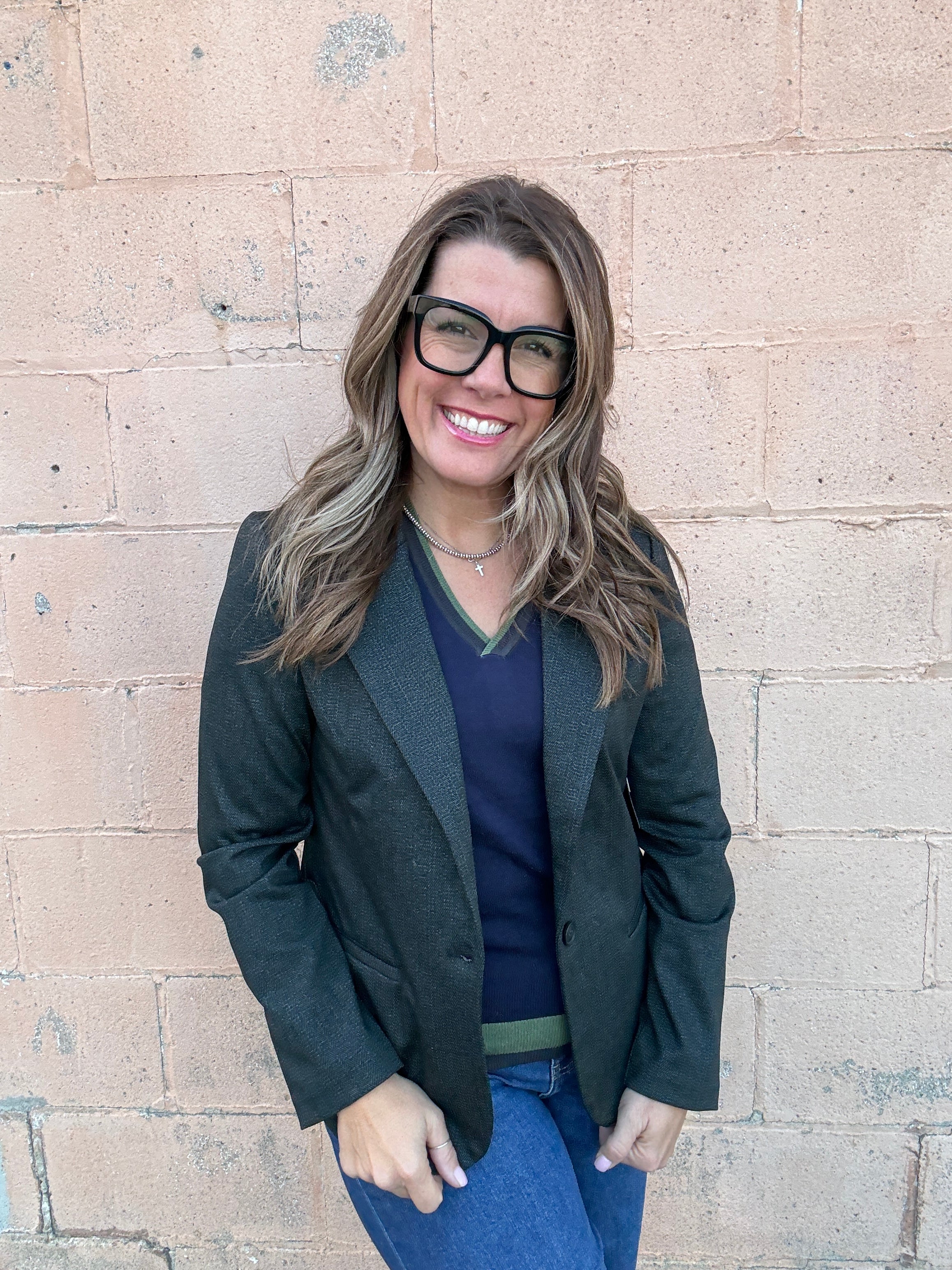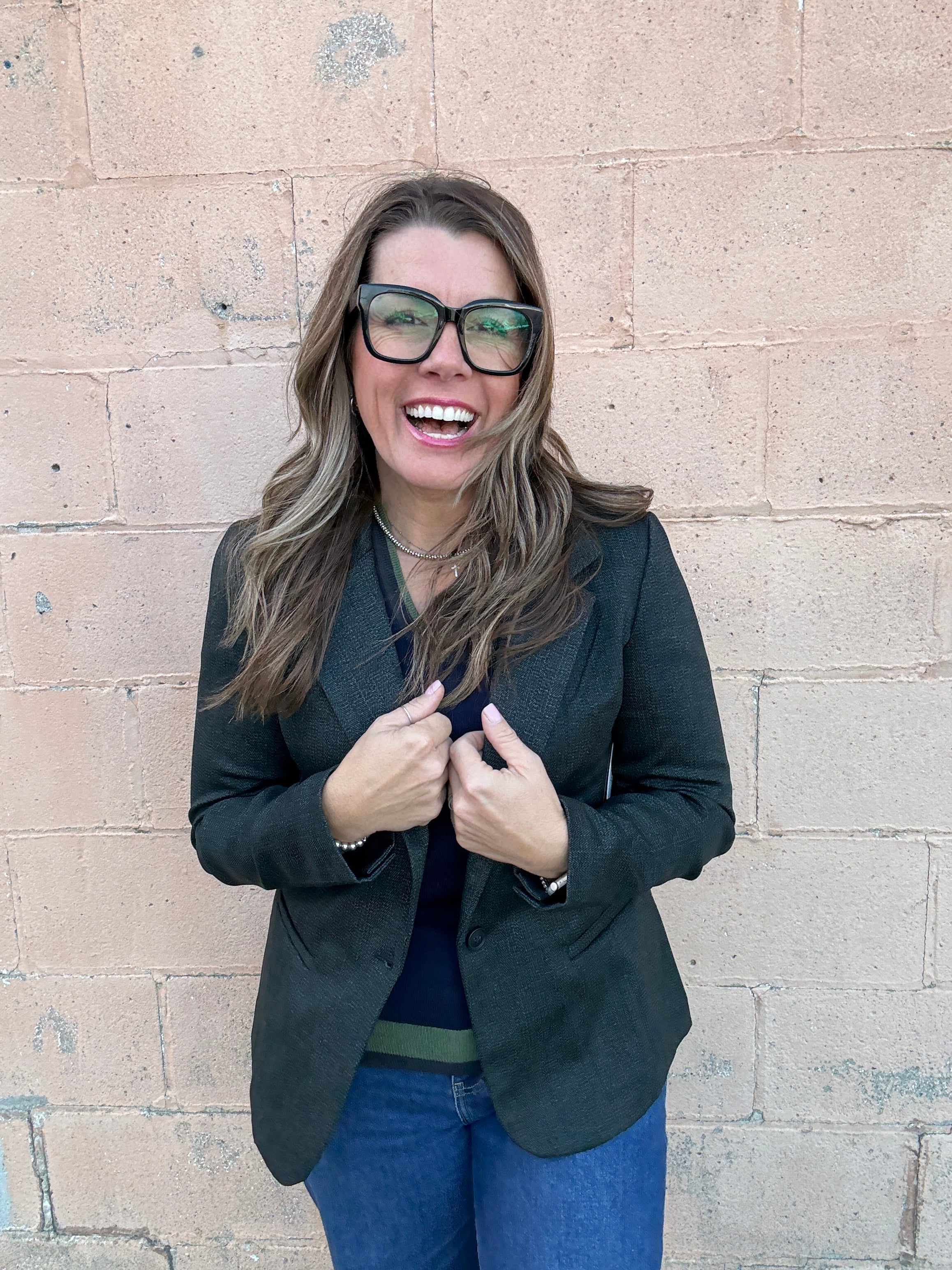 The perfect staple blazer is here!  This fitted blazer features a sophisticated charcoal herringbone, making it suitable for any occasion. With its sleek design and versatile style, this blazer is a must-have for any wardrobe.