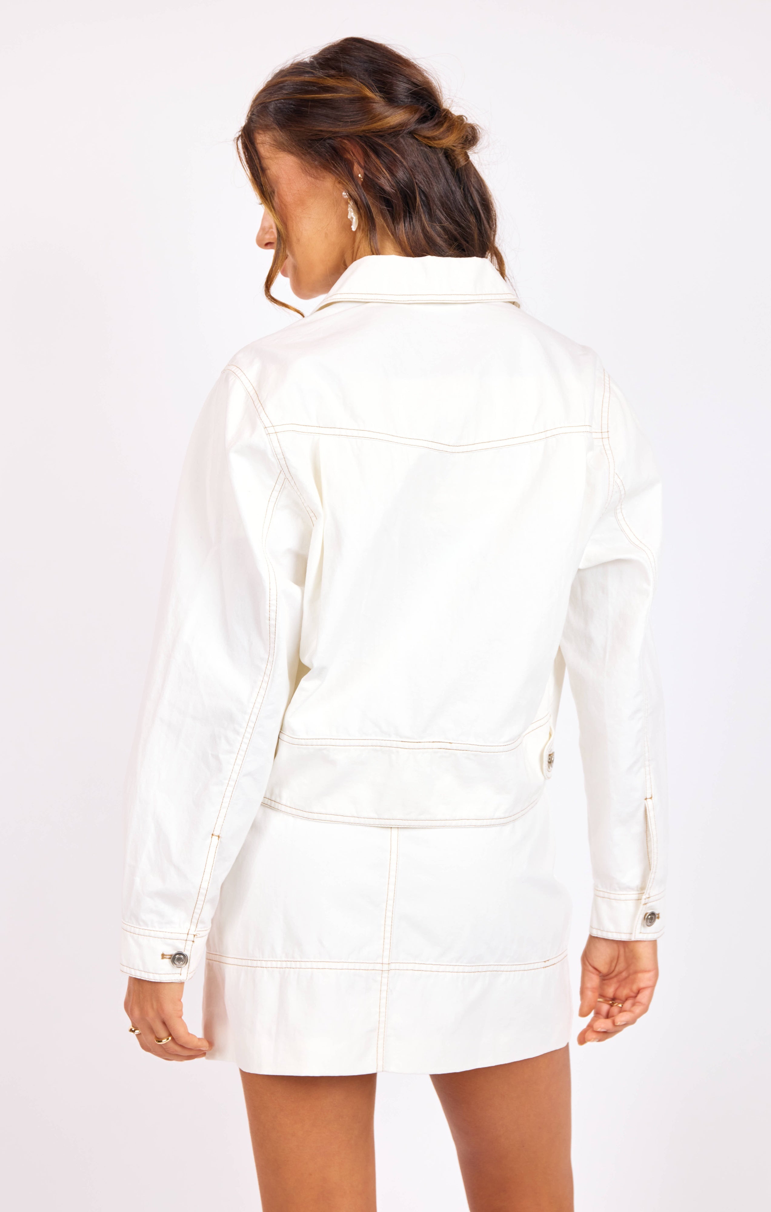 The Skywatch Contrast Stitch Jacket by Sage the Label is a versatile spring essential crafted from 100% cotton. Its crisp white finish and polished collar deliver effortless sophistication, while the hip-length cut creates a flattering silhouette that works seamlessly from casual to polished occasions. Style# LJ1542.