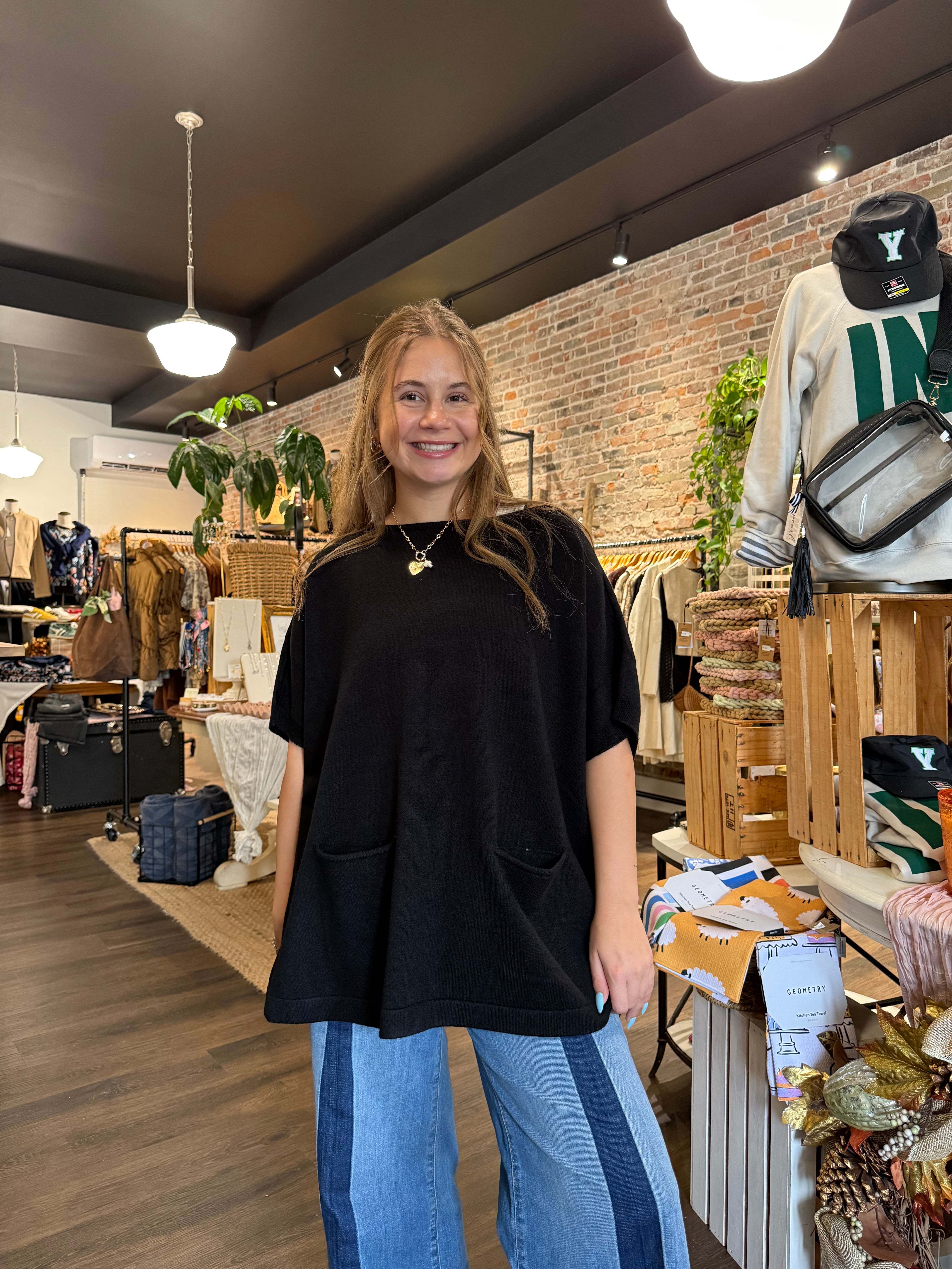 This cozy black dolman sweater is all about comfort and style, featuring handy front pockets for a chic touch. With its roomy fit, it’s great solo or layered over your go-to shirt or blouse for effortless flair.