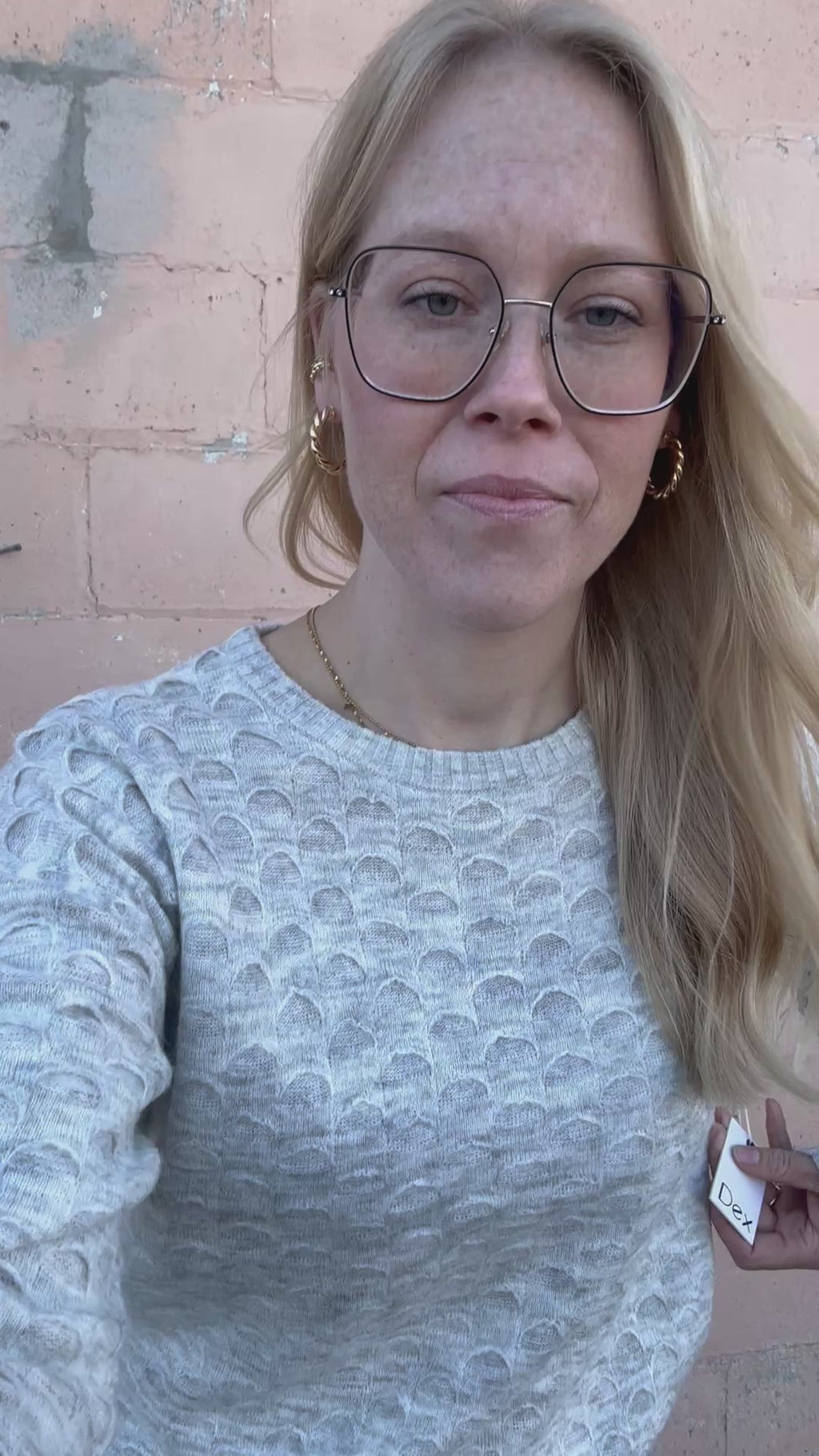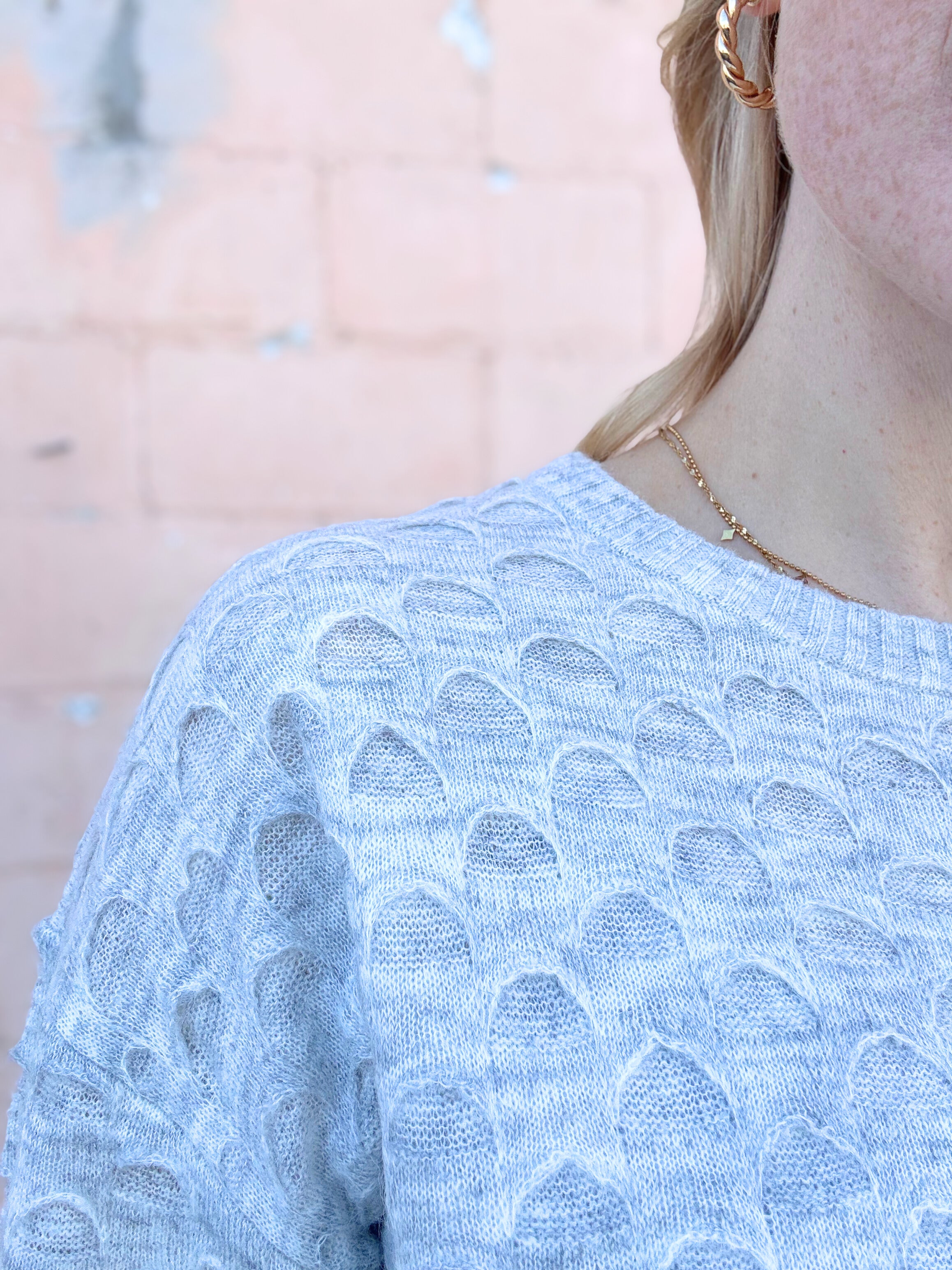 The light gray sweater from Dex features a beautiful wave-like knit pattern that is airy while also keeping you warm! She is lightweight, great as a layering piece or on its own. Special and cute!!