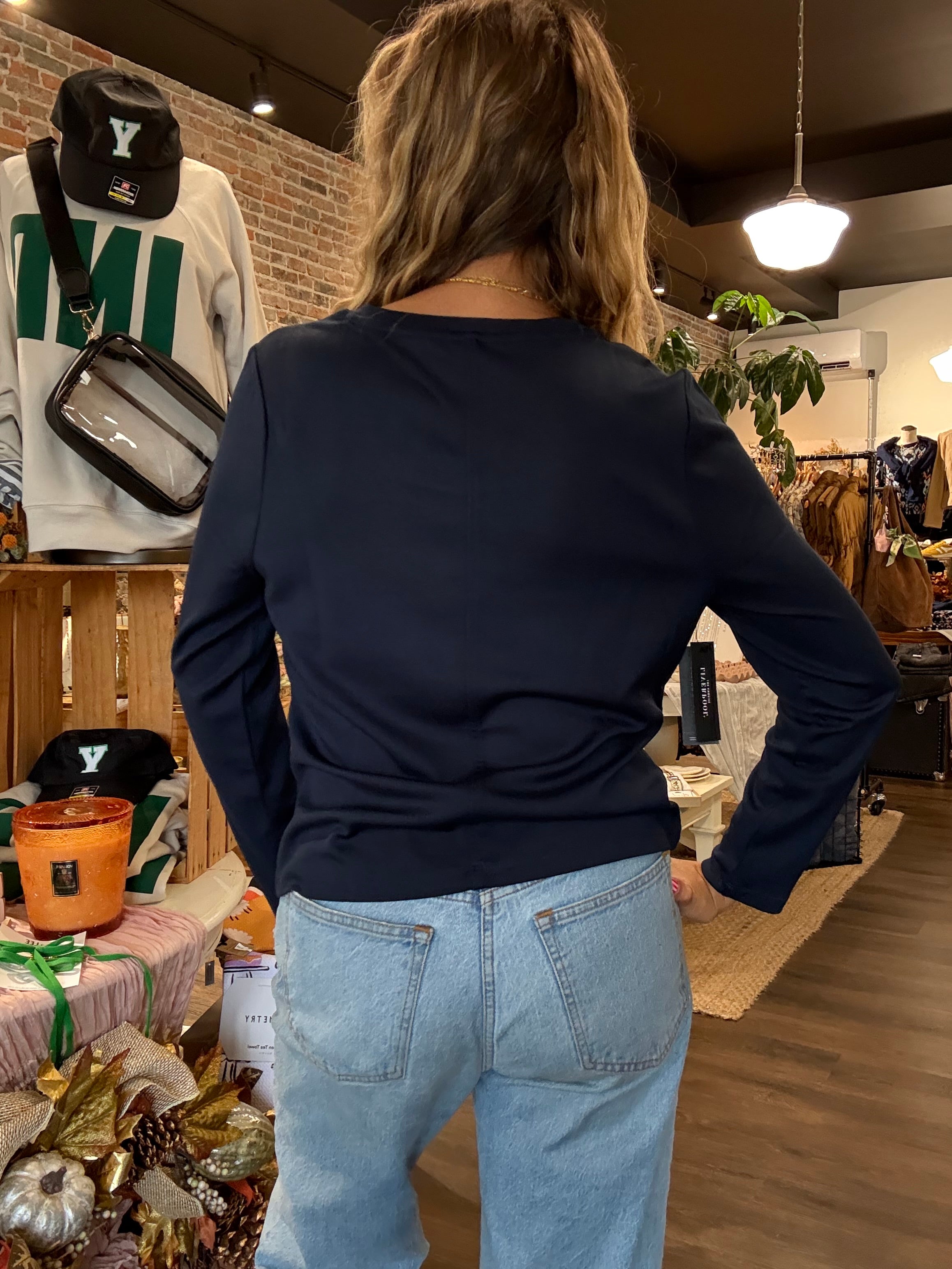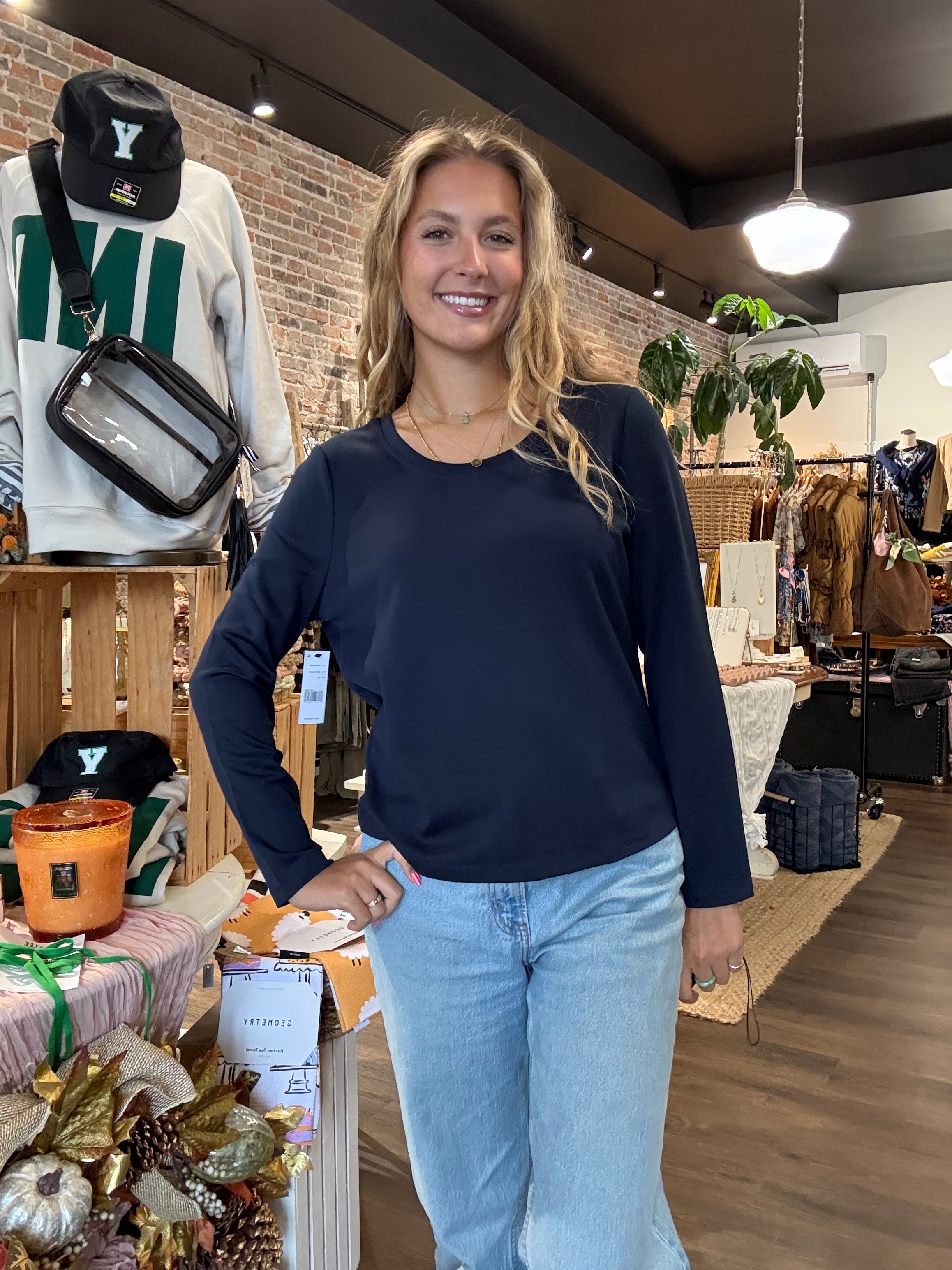 This long sleeve knit top in dark navy features a charming scoop neckline and a smooth, flowing fit that adds a touch of effortless style to your daily outfits. Made from a luxuriously soft fabric with just enough stretch, it’s the chic staple you’ll want to keep wearing over and over.