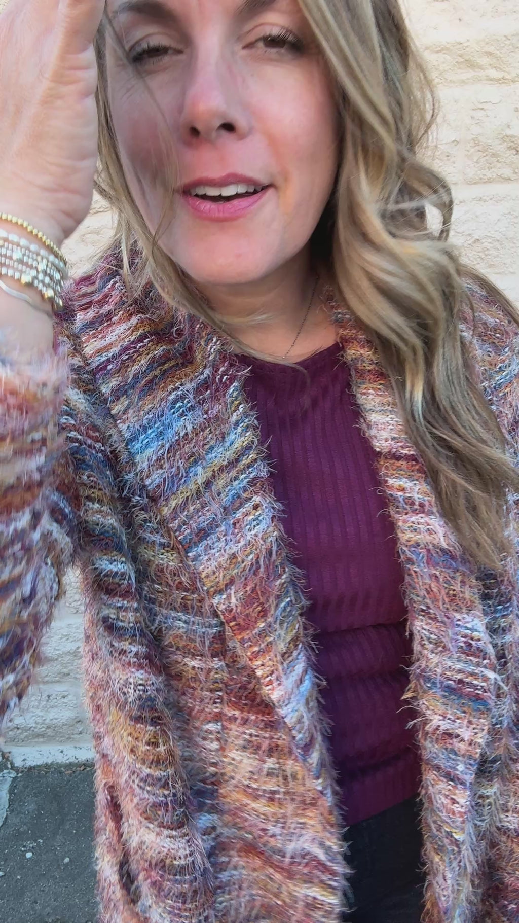 When the seasons begin to change and you need a timeless cardigan this is your go to! Crafted from the softest eyelash knit yarns, this cardigan feels like you are wearing a warm hug.